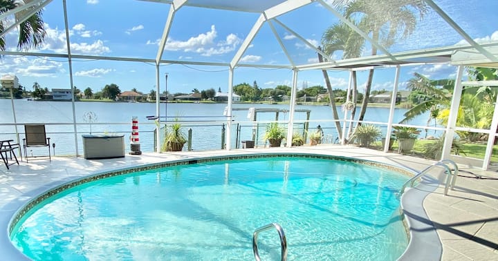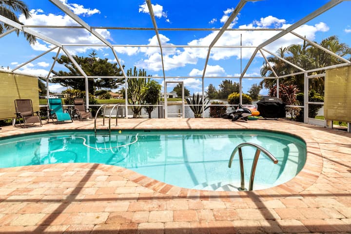 Cape Paradise is a spacious 4 bedroom den 2 bathrooms pet friendly Canal Front and Heated Pool home located in SW Cape Coral. This Cape Coral vacation home offers 3 bedrooms featuring 2 King and 2 Twin Size beds with 2 bathrooms. Save on Your Trip to Mexico.